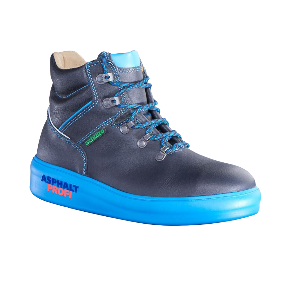 Die Sicherheitshochschuhe „Asphaltprofi“ von Schütze® ist ideal für die Straßenarbeit und Asphaltbauer geeignet. Das Obermaterial besteht aus öl- und schmutzabweisendem Leder (Stärke 2,1 mm). Das Innenmaterial besteht aus naturbelassenem Lederfutter. Die Laufsohle ist aus Gummi gefertigt und nach dem „Sealing Sole Edge System“ patentiert. Die glatte und hitzebeständige Laufsohle (kontakthitzebeständig bis 300° C nach EN ISO 20345) ist speziell für den Straßenbau entwickelt worden. Die Nitrilkautschukschale ist rutschfest, mikroben- und säurebeständig, öl- und benzinfest. Der Asphaltschuh ist hoch isoliert und mit wärme- und hitzebeständigem Spezialfaserstoff ausgelegt. Der Sicherheitshochschuh lässt sich mit Schnürsenkel schließen.