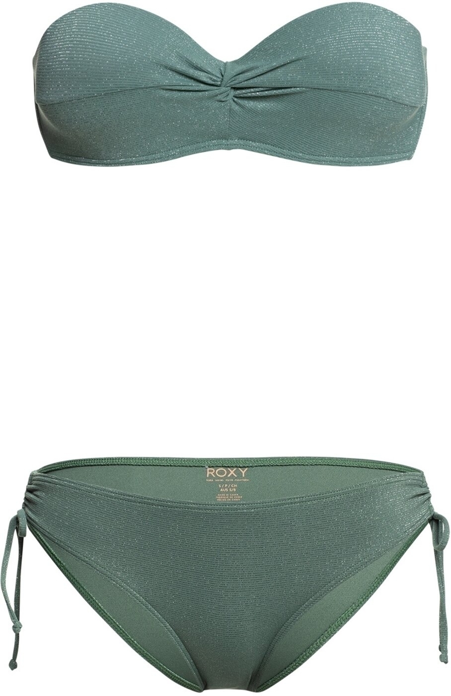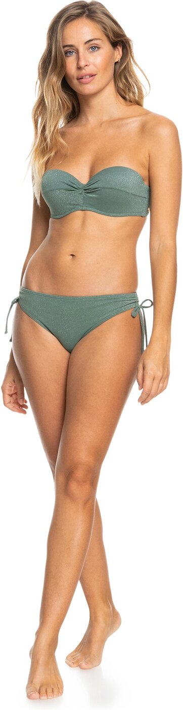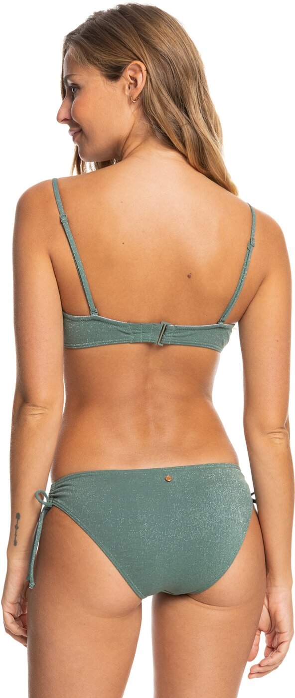 Bandeau-Bikini-Set für Frauen. Die Eigenschaften dieses Produkts sind: Weicher, recycelter, chlorresistenter, texturierter Lurex®-Rippstrick mit Stretch, vorgeformte Bandeau-Form, reguläre Unterstützung, Vorgeformte Körbchen, verstellbare und abnehmbare Träger mit Haken und Schieberverstellung, Haken mit 3 Löchern für verschiedene Längen hinten, Am besten geeignet für Körbchengrößen A/B/C, Rundes ROXY-Logo aus Metall, Verdrehtes Detail vorne für einen femininen Look, Bedeckung Unterteil: Hipster und TailleMittelhohe Taille. Material: 74% recyceltes Nylon, 12% Nylon, 8% Metallfasern, 6% Elasthan