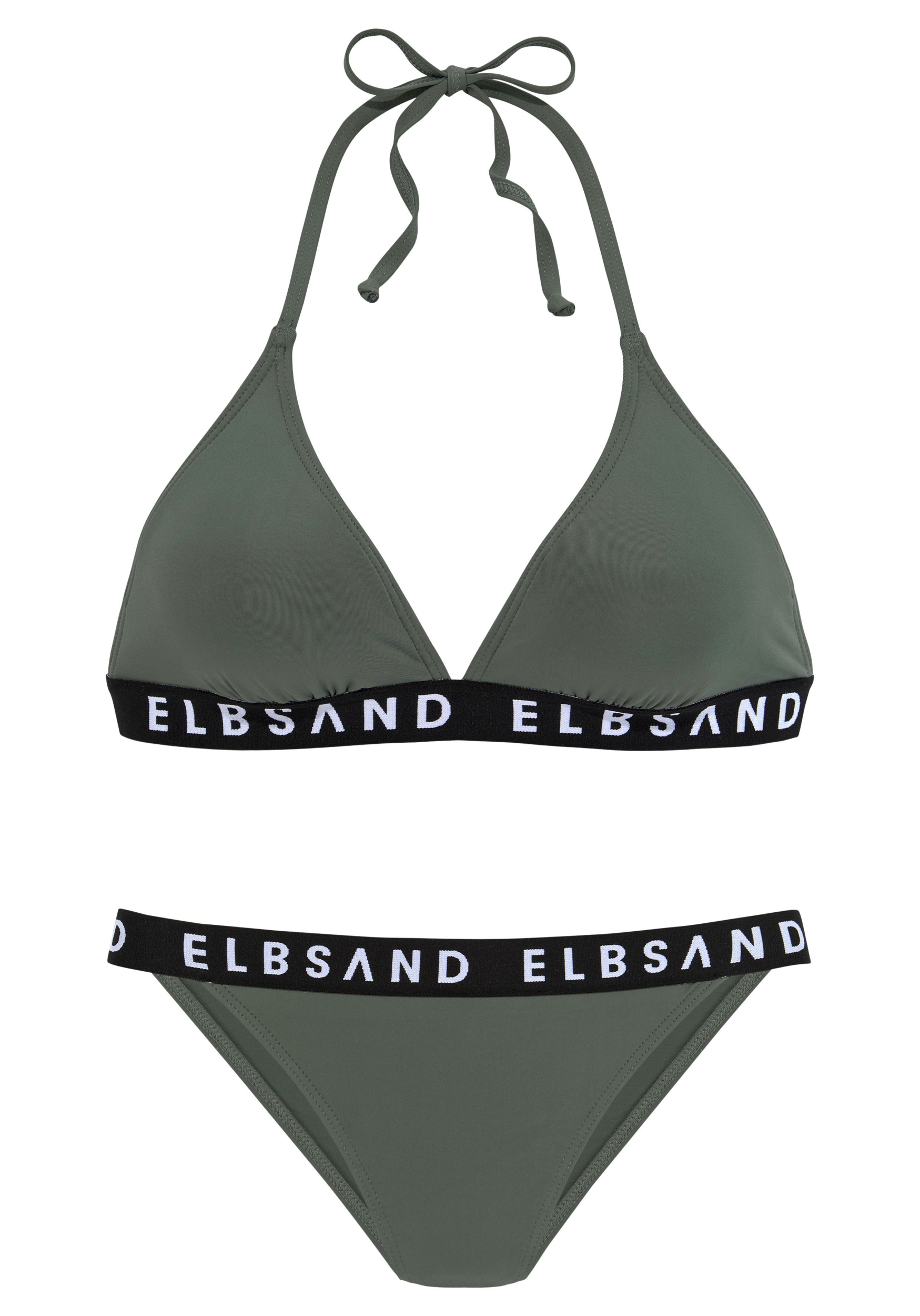 Elbsand LM Sportlicher Triangel-Bikini von Elbsand. Hingucker: elastisches Band mit Markenschriftzug an Top und Hose. Cups herausnehmbar. Neckholder. Bikinihose etwas knapper geschnitten. Ideal für den Strandurlaub. Trageangenehmes Material.