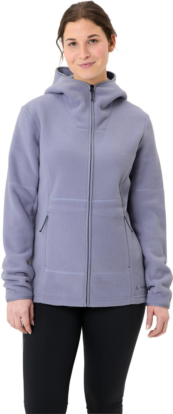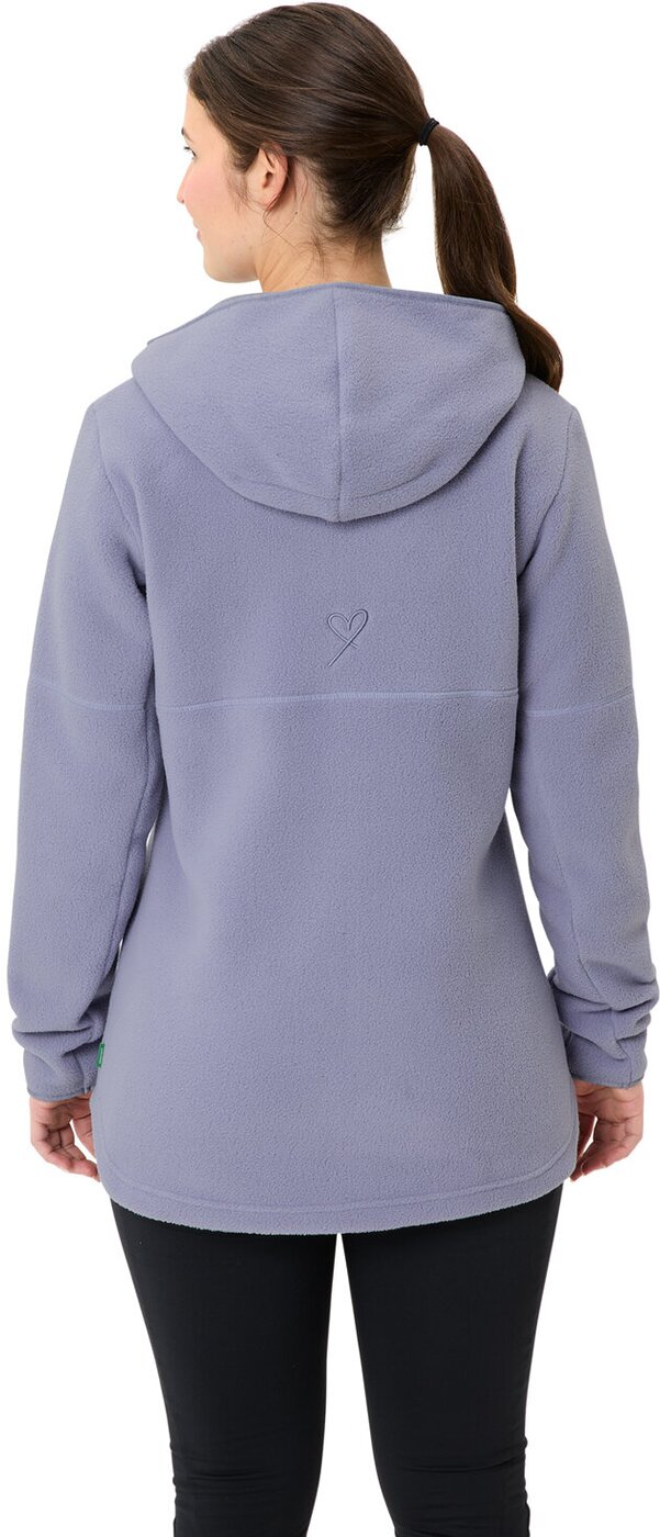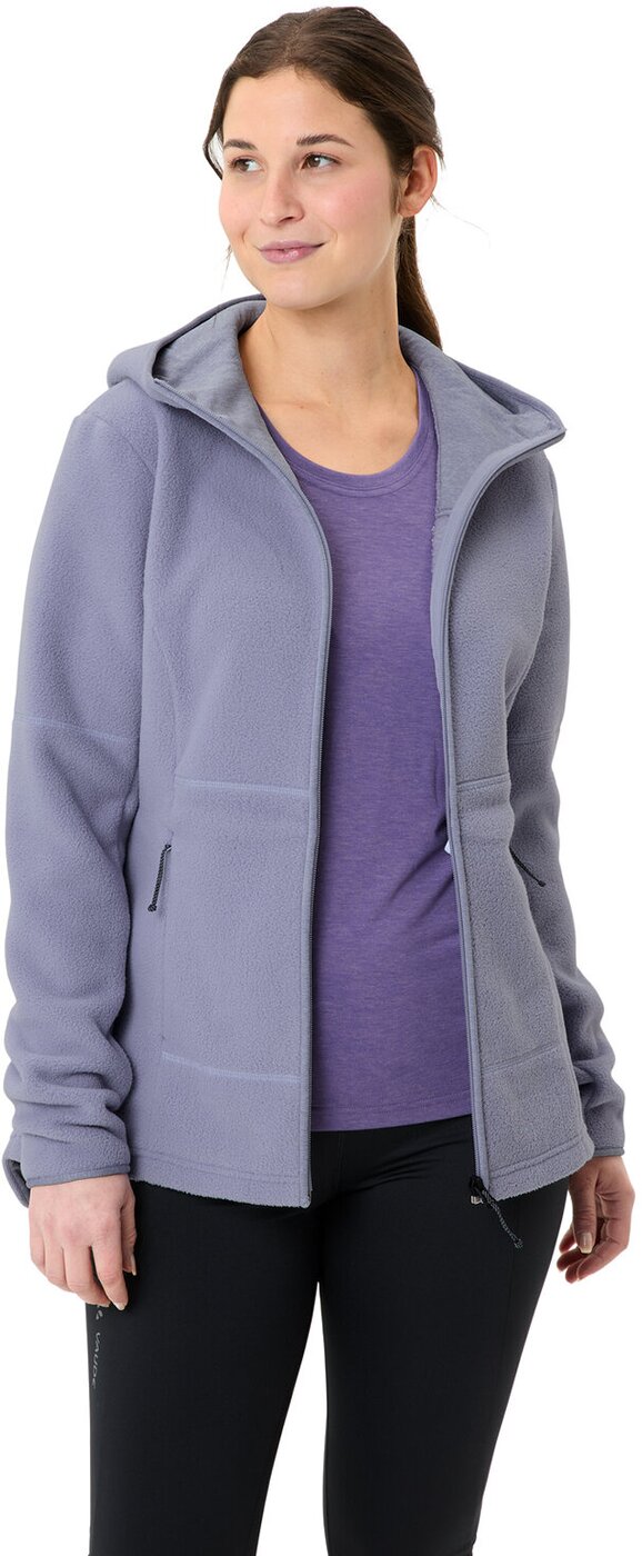 Der Neyland II Fleece Hoodie für Damen hat das Potenzial zum absoluten Lieblingsteil: Der lässig-lange Schnitt und das extrem kuschelige Material sorgen auch bei Schmuddelwetter für Wohlfühlatmosphäre. Mit 300 Gramm Materialgewicht pro Quadratmeter und einer hochflorigen Struktur spendet das Fleece jede Menge Wärme. Damit diese abends am Lagerfeuer nicht einfach über den Kopf entweicht, haben die VAUDE Designer*innen dem Neyland II Fleece Hoodie für Damen eine Kapuze mit geschmeidigem Jersey-Futter spendiert. Und für warme Hände ? oder natürlich auch Accessoires ? gibt?s zwei Fronttaschen mit Reißverschluss. Das VAUDE Green Shape-Label steht für ein umweltfreundliches, funktionelles Produkt aus nachhaltigen Materialien. Als Mitglied mit Leader Status bei der unabhängigen Organisation Fair Wear engagiert sich VAUDE für faire Arbeitsbedingungen und faire Löhne. Material: Hauptstoff: 100% Polyester (recycelt), Taschenfutter: 100% Polyester (recycelt)