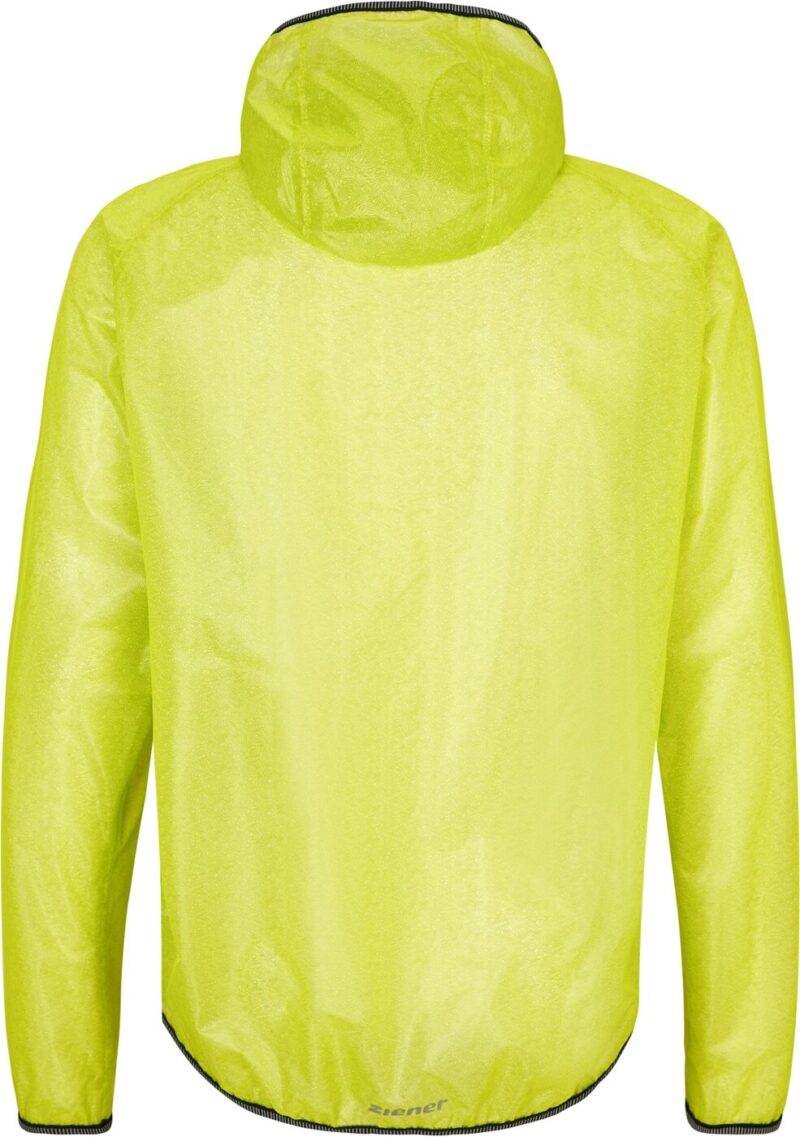 Die ZIENER Herren Regenjacke NATIUS MAN ist der optimale Begleiter auf sämtlichen Radtouren, da sie sich leicht in dem mitgelieferten Beutel verstauen lässt ? für ein kleines und leichtes Packmaß! Die wasserdichte, winddichte und atmungsaktive AQUASHIELD® Membran sorgt bei Wind und Wetter für ein angenehmes, trockenes Klima (Wassersäule 10.000mm/Atmungsaktivität 10.000g/m²/24h). Zudem sind die Nähte vertapt. Dank der Kapuze ist man jederzeit vor Regen geschützt. Der elastische Abschluss am Saum, Ärmel und der Kapuze sorgt für den perfekten Sitz. Die Jacke ist mit dekorativen reflektierenden Designelementen versehen. Dank der umweltfreundlichen Imprägnierung ist das Produkt PFC frei. Material: Obermaterial: 100% Polyester